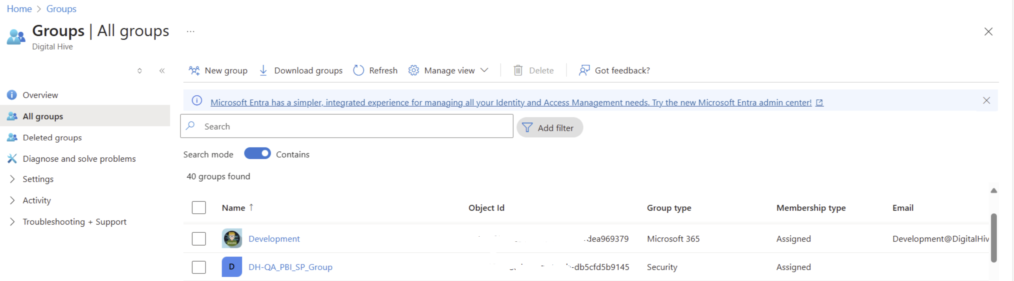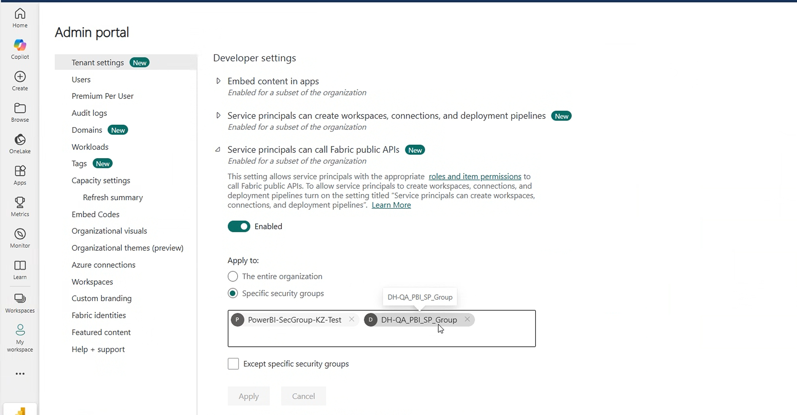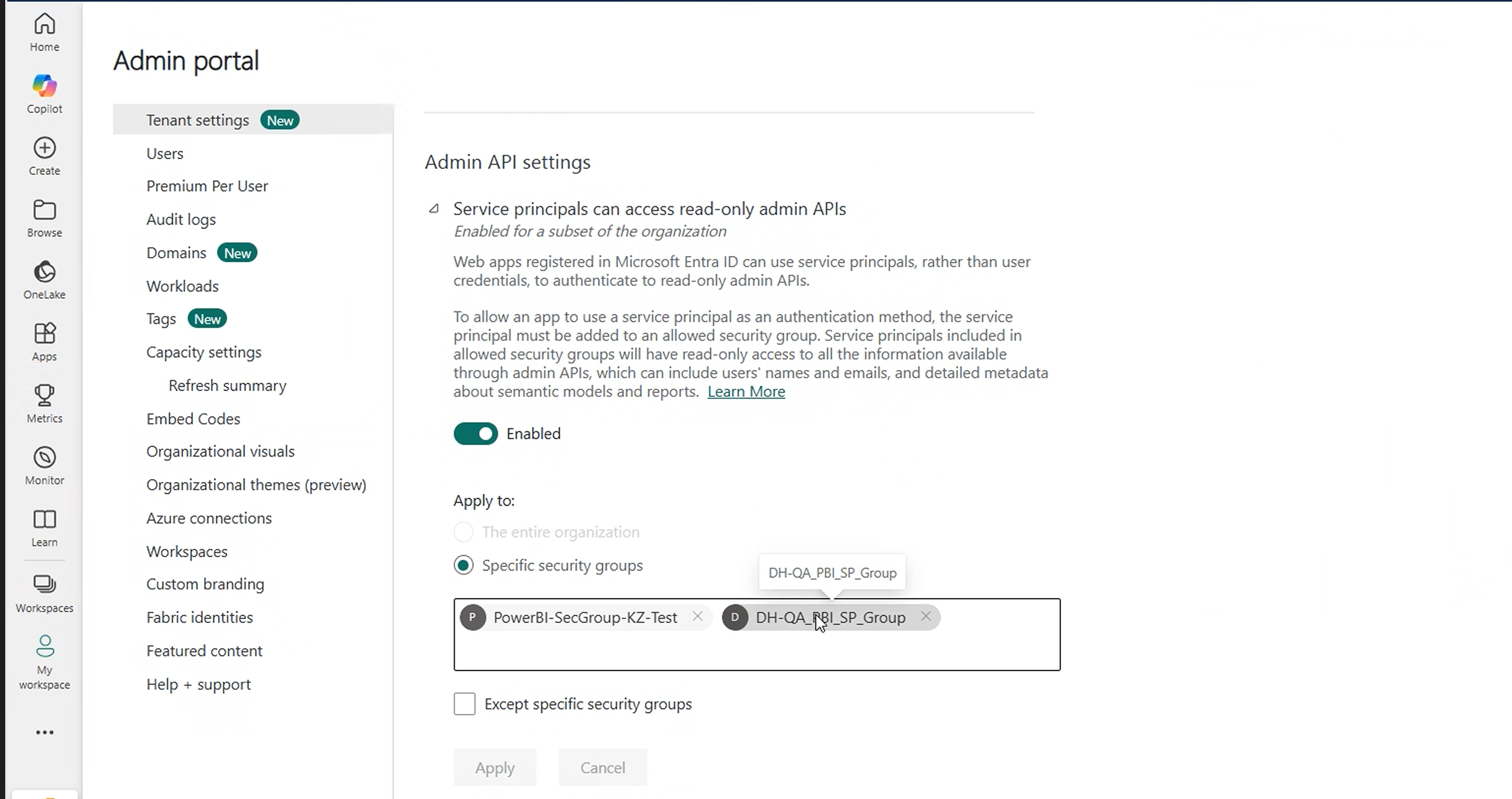 member within this Security Group. The name of my Security group is DH-QA_PBI_SP_Group.