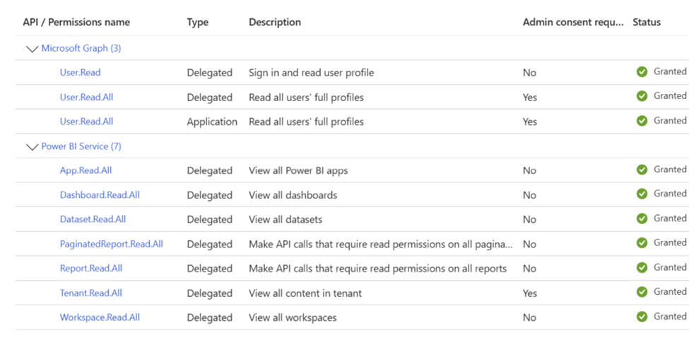 Azure App Permissions. In my case here, I called it DH-Test-PBI. Below is a screenshot of the App and the minimal API permissions list.