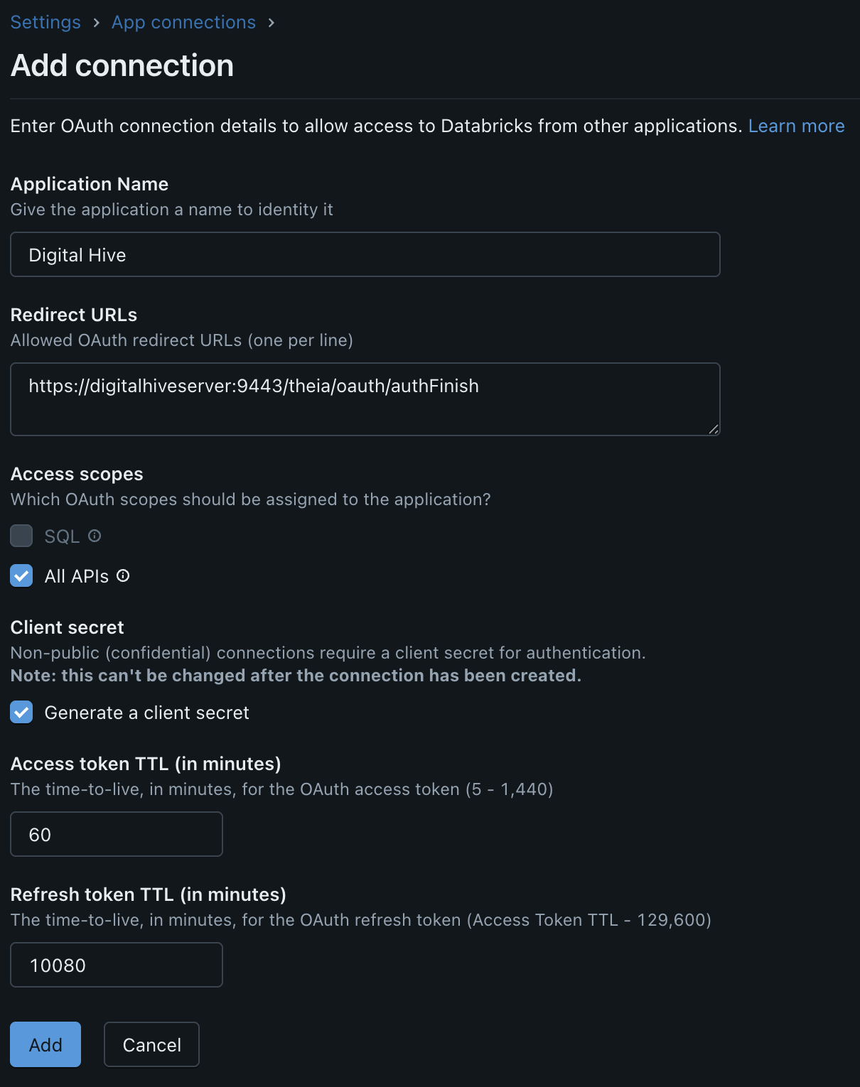 As of the 2026.1 Digital Hive release, Databricks is a supported content system and an out of the box connector is available. Before Databricks can be added to Digital Hive, an App Connection must first be created within the Databricks settings.