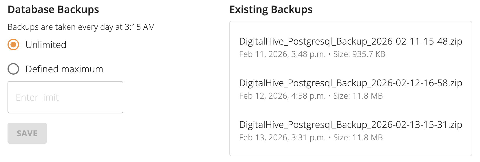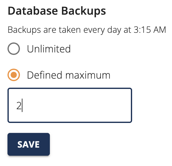 - In the Database Backups section, the default is set to "Unlimited", which means that there will be an automated backup performed every day at 3:15AM. By selecting the Defined Maximum option, you can specify the number of backups that will be kept