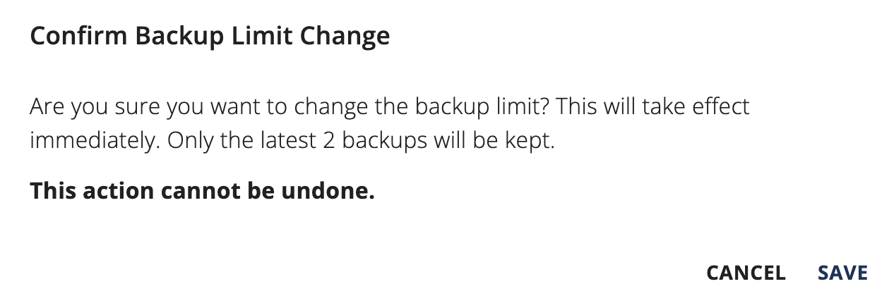 - After saving, you will be prompted with a confirmation message informing you that this will take effect immediately, and will remove the extra backups files from the system, which can not be undone
